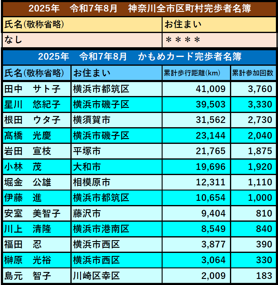 完歩者アーカイブ これまでの完歩者リスト 2027年度 2026年度 2025年度4月>>5月>>6月>>7月>>8月>>9月>> 2024年度4月>>5月>>6月>>7月>>8月>>9月>>10月>>11月>>12月>>1月>>2月>>3月>> 2023年度3月>>2月>>1月>>12月>>11月>>10月>>9月>>8月>>7月>>6月>>5月>>4月>> 2022年度3月>>2月>>1月>>12月>>11月>>10月>>9月>>8月>>7月>>6月>>5月>>4月>> 2021年度3月>> 2月>> 1月>> 12月>> 11月>> 10月>> 9月>>8月>>7月>>6月>>5月>> 1月~4月>> 2020年度12月 >>11月 >>10月 >>9月 >>8月 >> 特別イベント 完歩者リスト 神奈川七福神巡り ・2024年1月 鎌倉七切り通し大会 ・2023年10月12日 ・2024年10月17日 箱根峠越えウォーク大会 ・2024年4月29日 ・2025年4月29日 トップページに戻る 完歩者紹介