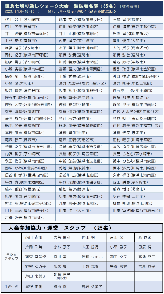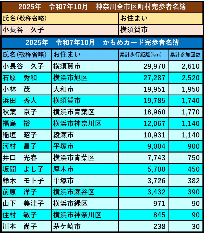 完歩者アーカイブ これまでの完歩者リスト 2027年度 2026年度 2025年度4月>>5月>>6月>>7月>>8月>>9月>>10月>> 2024年度4月>>5月>>6月>>7月>>8月>>9月>>10月>>11月>>12月>>1月>>2月>>3月>> 2023年度3月>>2月>>1月>>12月>>11月>>10月>>9月>>8月>>7月>>6月>>5月>>4月>> 2022年度3月>>2月>>1月>>12月>>11月>>10月>>9月>>8月>>7月>>6月>>5月>>4月>> 2021年度3月>> 2月>> 1月>> 12月>> 11月>> 10月>> 9月>>8月>>7月>>6月>>5月>> 1月~4月>> 2020年度12月 >>11月 >>10月 >>9月 >>8月 >> 特別イベント 完歩者リスト 神奈川七福神巡り ・2024年1月 鎌倉七切り通し大会 ・2025年10月18日 ・2024年10月17日 ・2023年10月12日 箱根峠越えウォーク大会 ・2025年4月29日 ・2024年4月29日 トップページに戻る 完歩者紹介