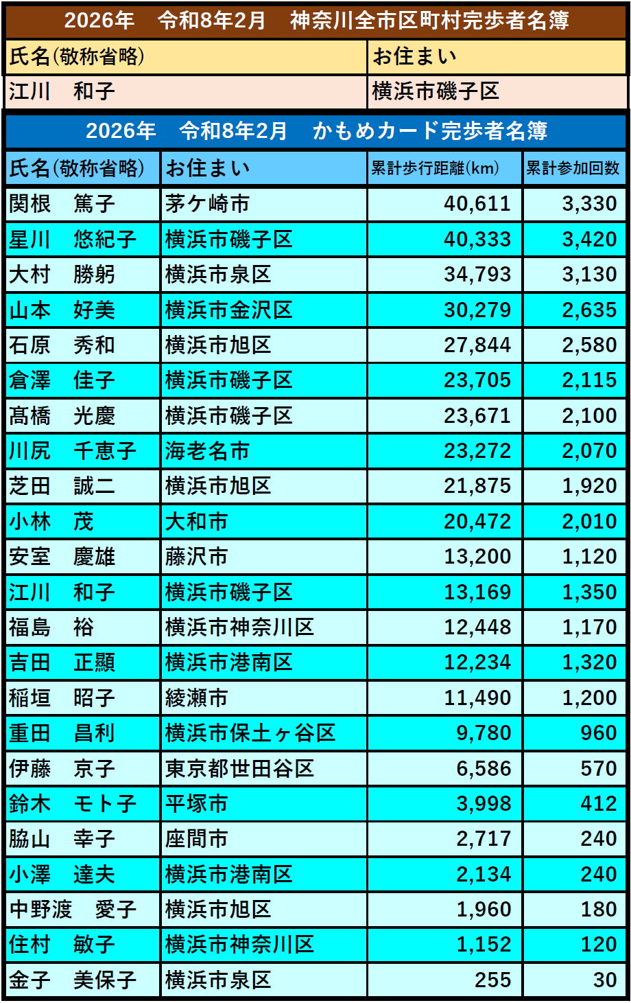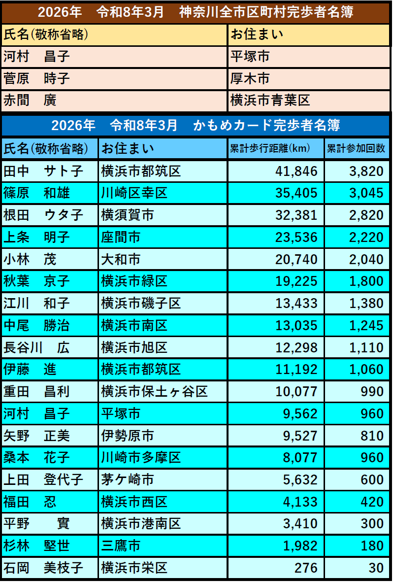 完歩者アーカイブ これまでの完歩者リスト 2027年度 2026年度 2025年度4月>>5月>>6月>>7月>>8月>>9月>>10月>>11月>>12月>>1月>>2月>>3月>> 2024年度4月>>5月>>6月>>7月>>8月>>9月>>10月>>11月>>12月>>1月>>2月>>3月>> 2023年度3月>>2月>>1月>>12月>>11月>>10月>>9月>>8月>>7月>>6月>>5月>>4月>> 2022年度3月>>2月>>1月>>12月>>11月>>10月>>9月>>8月>>7月>>6月>>5月>>4月>> 2021年度3月>> 2月>> 1月>> 12月>> 11月>> 10月>> 9月>>8月>>7月>>6月>>5月>> 1月~4月>> 2020年度12月 >>11月 >>10月 >>9月 >>8月 >> 特別イベント 完歩者リスト 神奈川七福神巡り ・2024年1月 鎌倉七切り通し大会 ・2025年10月18日 ・2024年10月17日 ・2023年10月12日 箱根峠越えウォーク大会 ・2025年4月29日 ・2024年4月29日 トップページに戻る 完歩者紹介