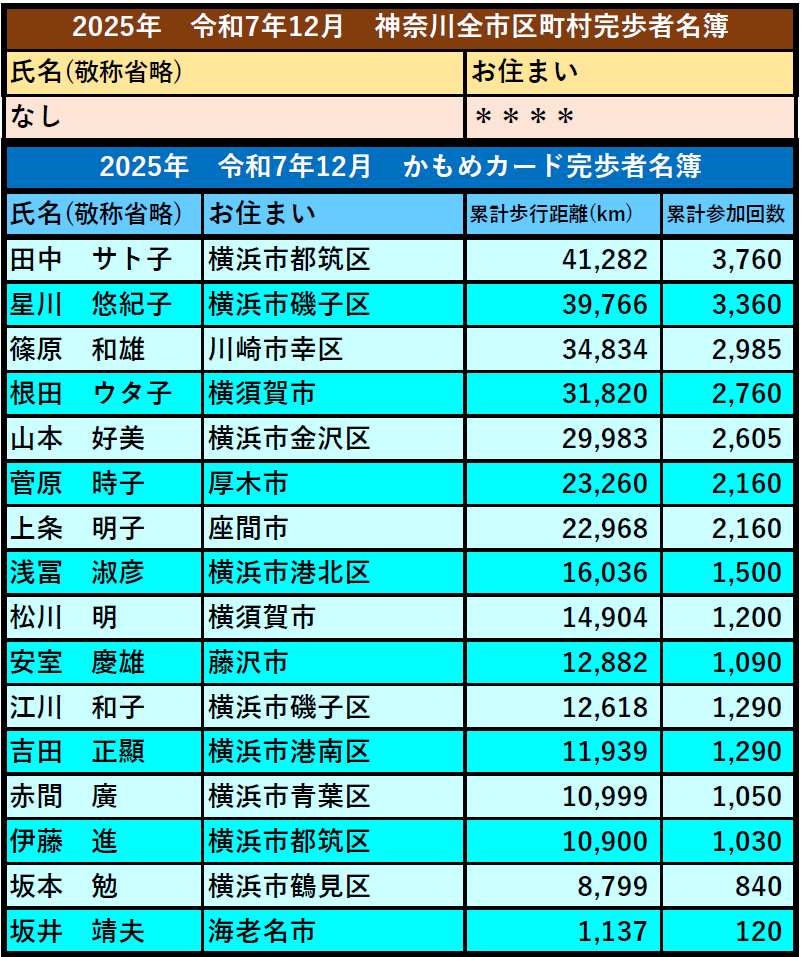 神奈川全市町村・区完歩者 (2025年12月) なし かもめカード完歩者名簿 (2025年12月) かもめカード完歩者ARK1月号 令和6年 神奈川七福神巡り 完全踏破者 : 13名 令和6年七福神完全踏破者 令和6年 神奈川七福神巡り 7回以上踏破者:29名 令和6年七福神7回以上踏破者 鎌倉七切り通しウォーク大会・踏破者 :10月18日(土) 2025年鎌倉七切通踏破者 トップページに戻る 完歩者アーカイブ